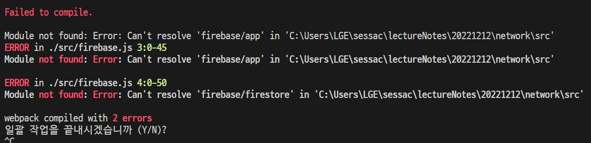 Module not found: Error: Can't resolve 'firebase/app' in 'C:\Users\LGE\sessac\lectureNotes\20221212\network\src'