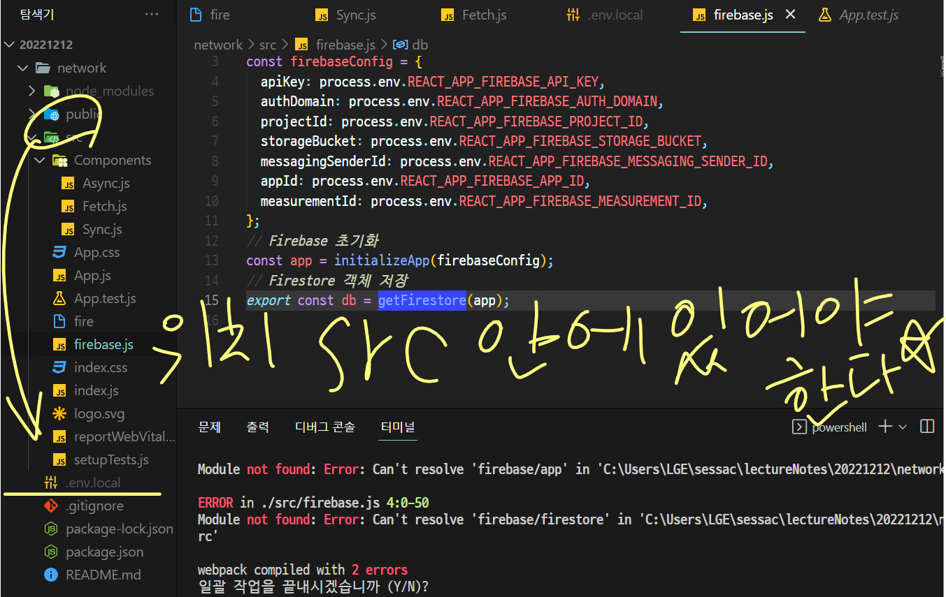 Module not found: Error: Can't resolve 'firebase/firestore' in 'C:\Users\LGE\sessac\lectureNotes\20221212\network\src'