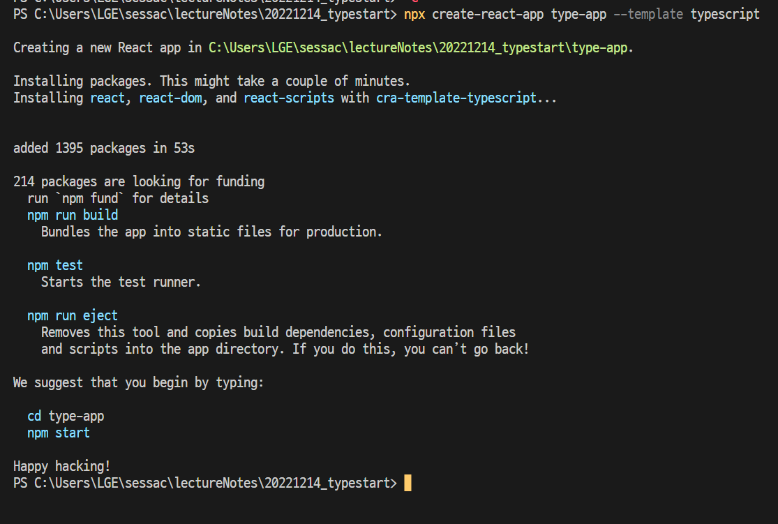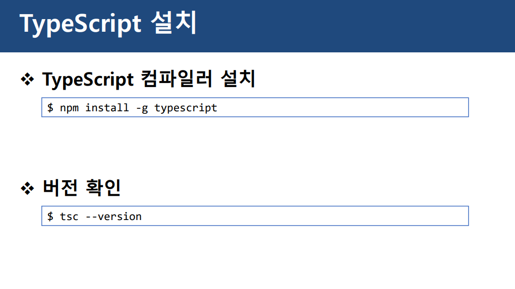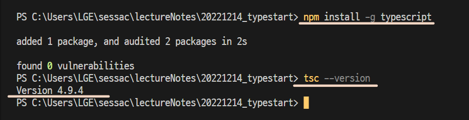 -g : 글로벌로 설치한다 : 컴퓨터 전역에 설치하겠다. , 즉 다른 곳에서도 타입스크립트 컴파일러를 설치한다.