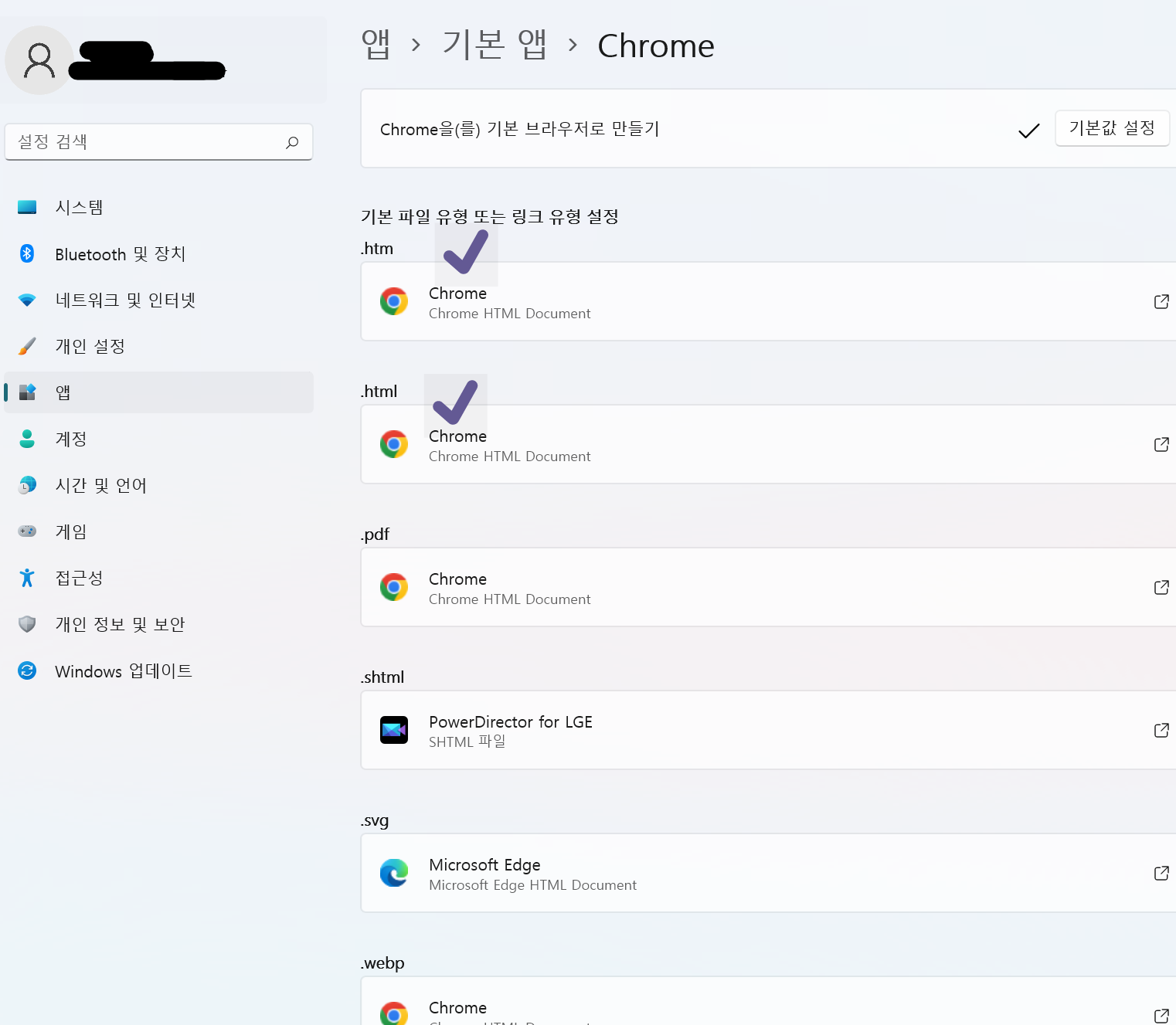 가장 위의 것 .htm과 .html 을 Chrome으로 변경했다.
