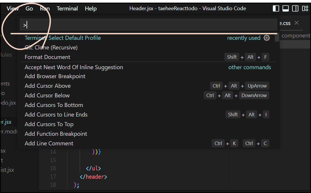 Ctrl + Shift + P 사용하는 VS Code 모습