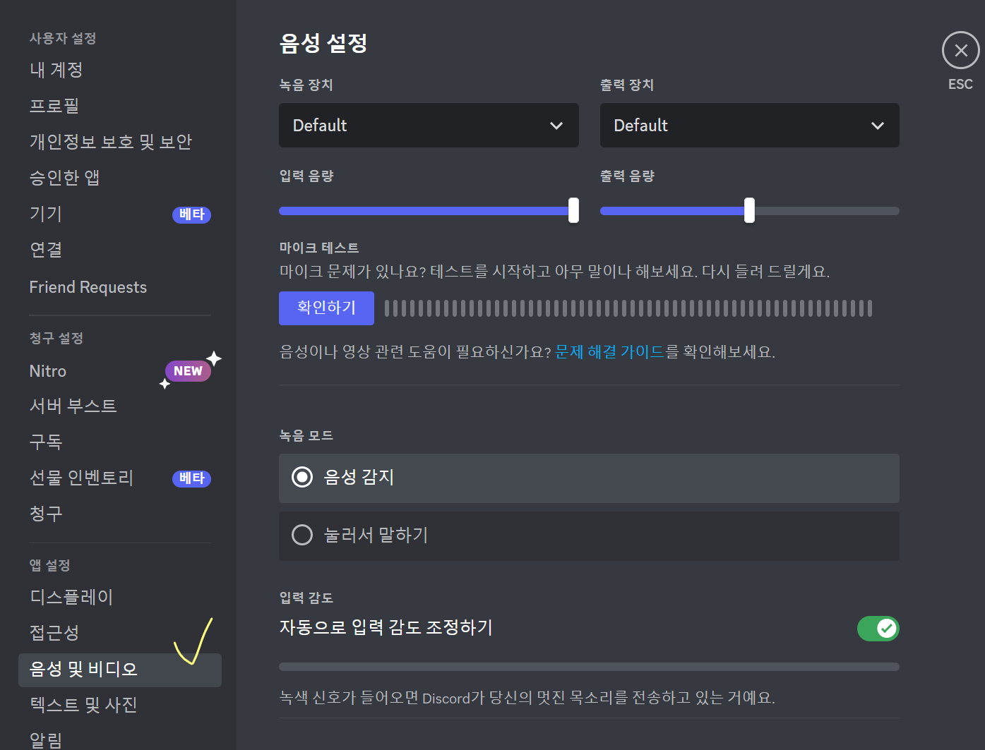 [설정 > 음성 및 비디오] 에서 하면 된다.