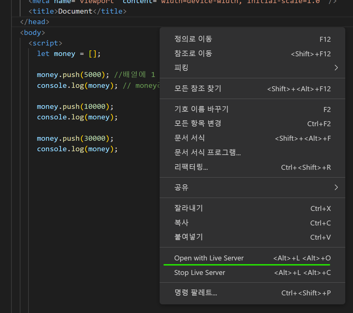 비쥬얼 스튜디오 코드에서 Open with Live Server(단축키 :ALT + L +O )로 창을 띄워서 확인해야 하는 반면