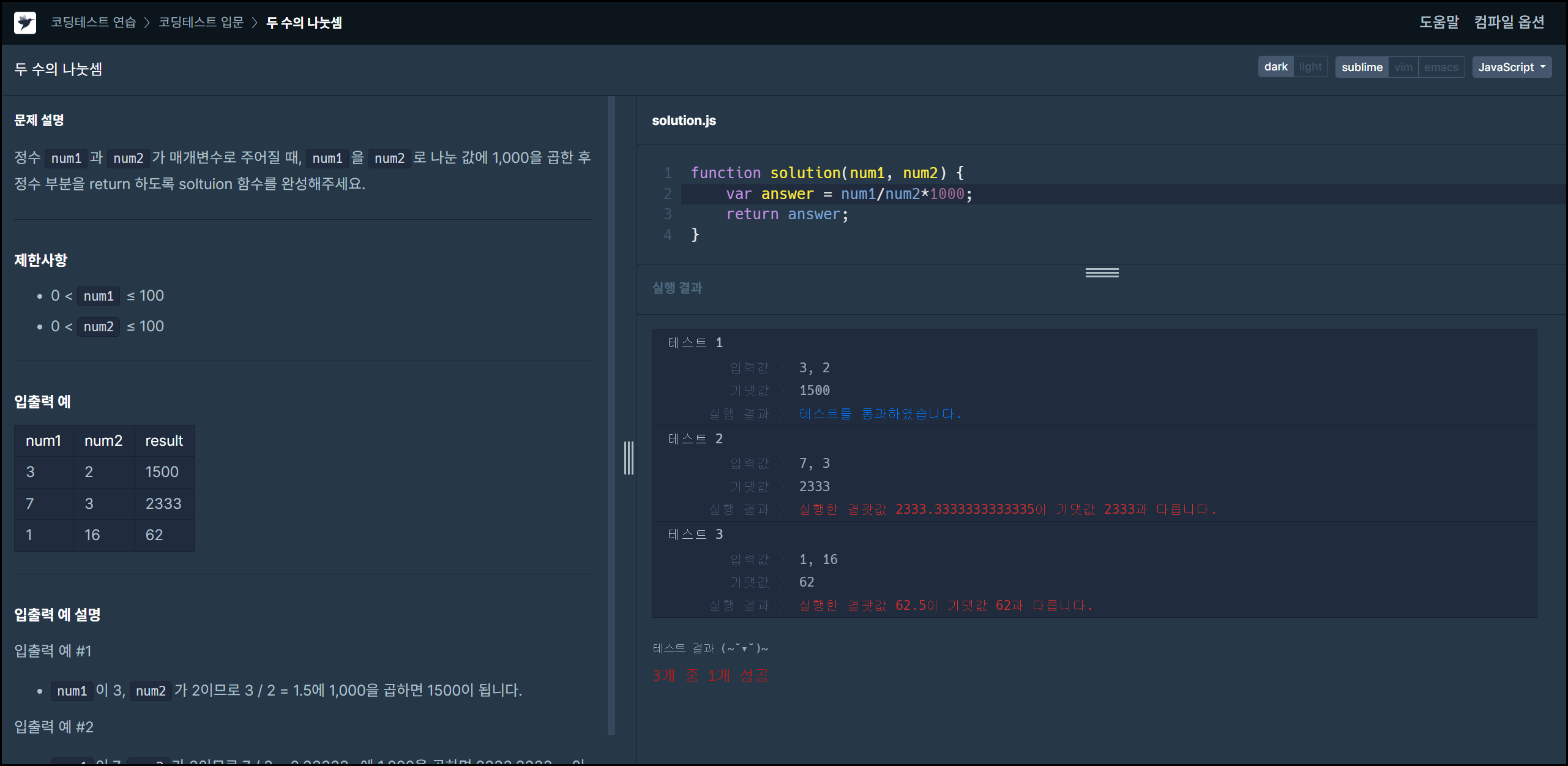 두 수의 나눗셈 _ 자바스크립트