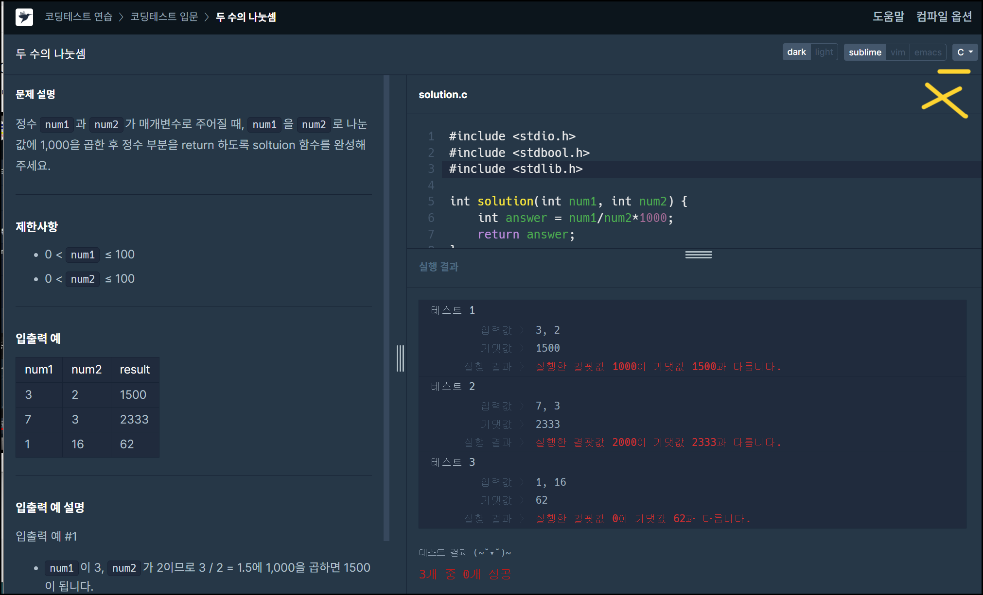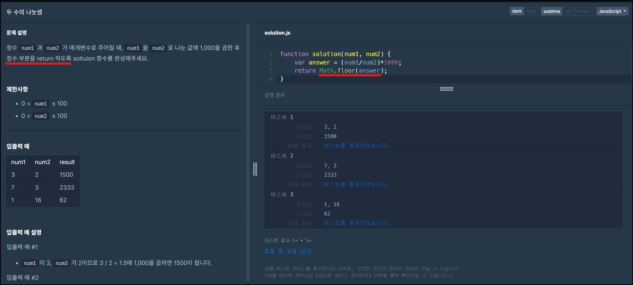 정수 num1과 num2가 매개변수로 주어질 때, num1을 num2로 나눈 값에 1,000을 곱한 후 정수 부분을 return 하도록 soltuion 함수를 완성해주세요.