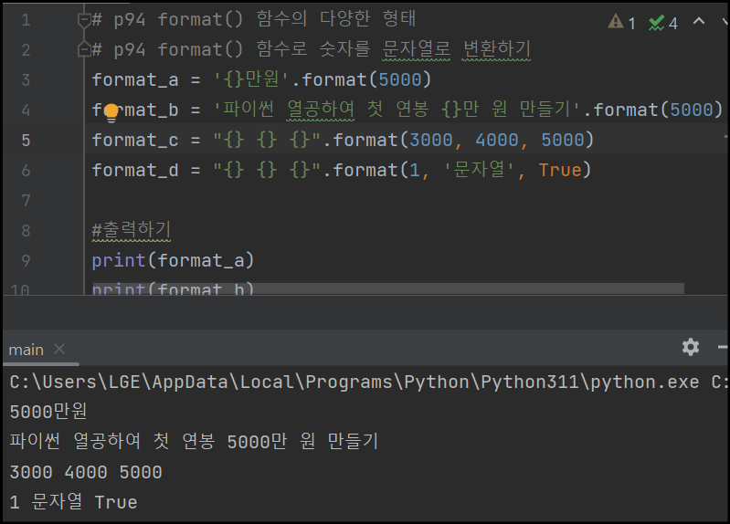 format()함수는 문자열이 가지고 있는 함수입니다. 중괄호{}를 포함한 문자열 뒤에 마침표(.)를 찍고 format()함수를 사용하는데, 중괄호의 개수와 format 함수 괄호 안 매개변수의 개수는 반드시 같아야 합니다.