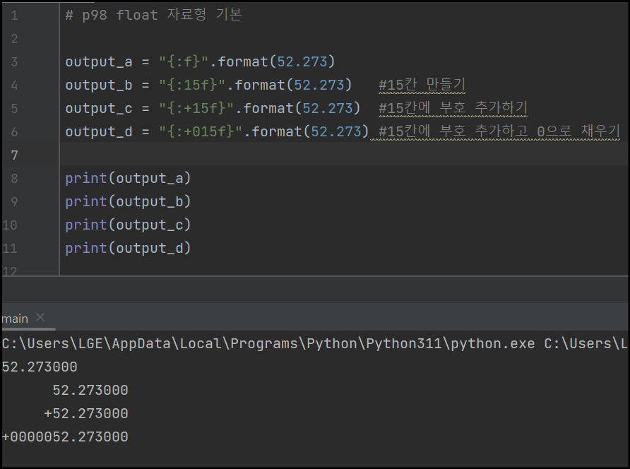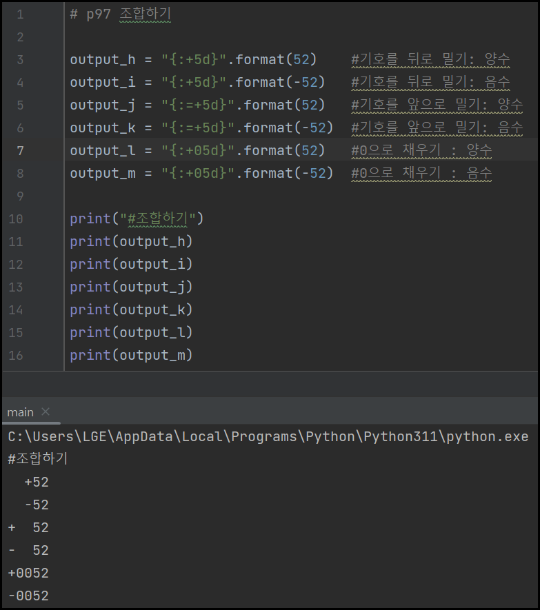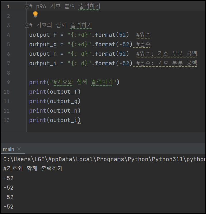{: d} d에 공백을 두면 양수의 경우에 기호 위치를 공백으로 비워줍니다.