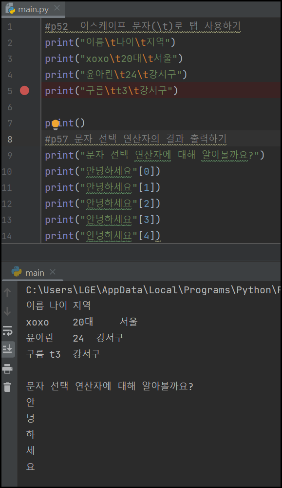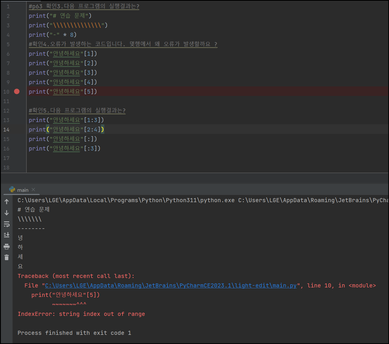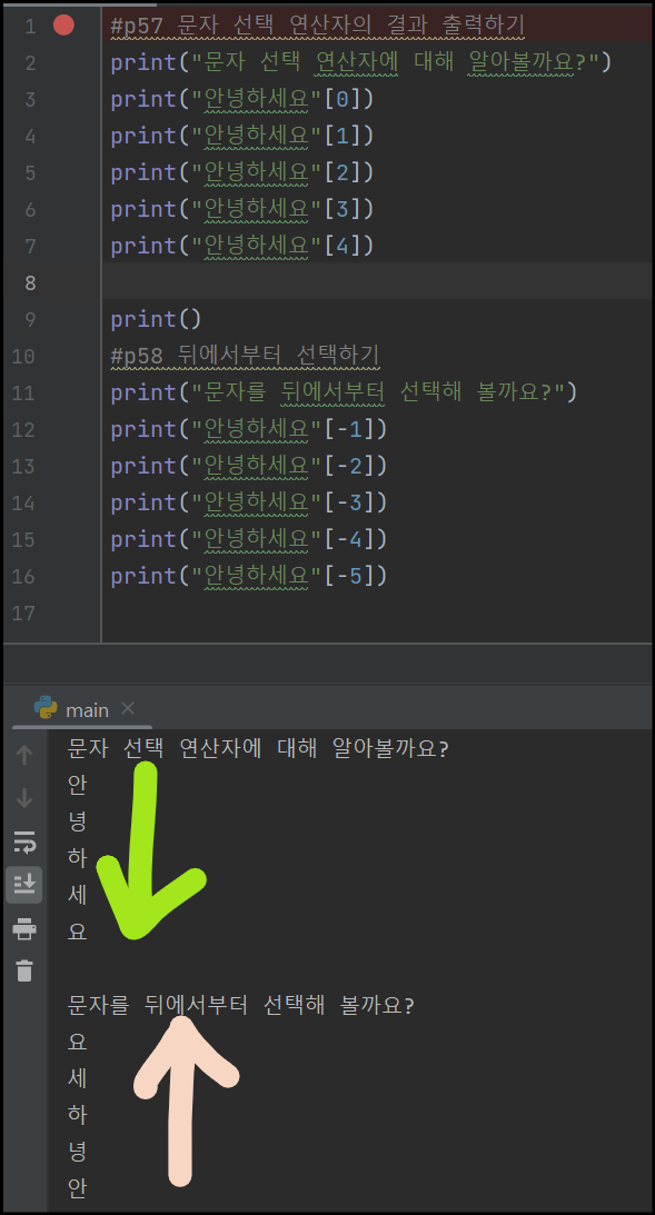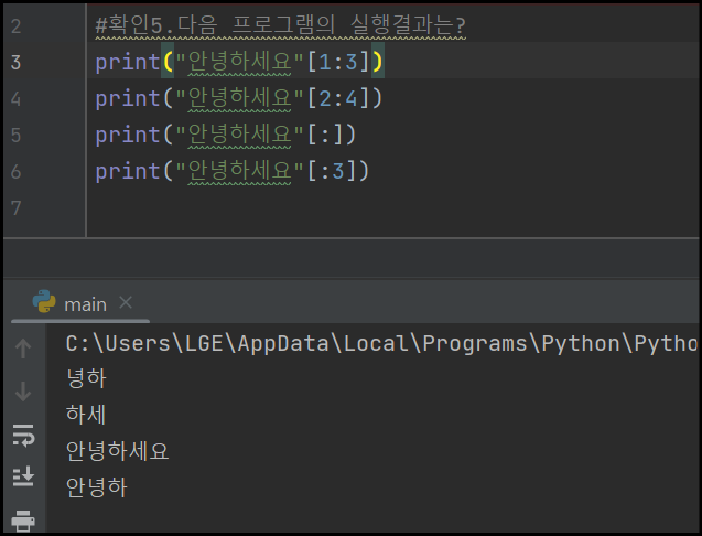 #확인4 👉 파이썬은 문자 선택 연산자에서 인덱싱할 때 0부터 셉니다. 👉 안녕하세요. 5글자 니까 5-1 = [0부터:4까지]