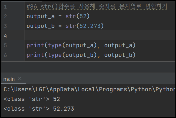 str(다른 자료형) : 다른 자료형의 값을 str()함수의 매개변수에 넣으면 문자열로 변환된다.