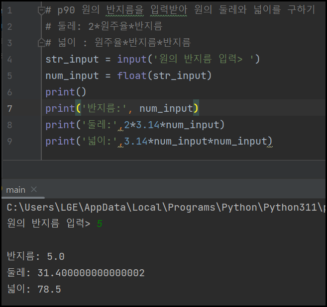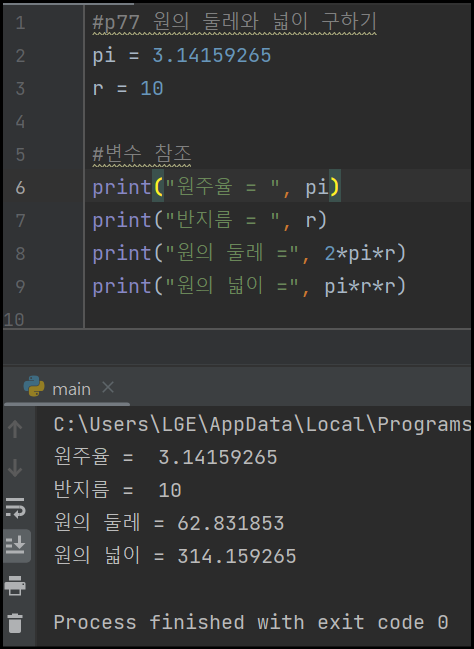 변수 안에 있는 값을 사용하는 것을 '변수 참조'라고 합니다. ex. 계산할 때 값인 3.1415926를 일일히 작성하지 않고 pi, π 기호를 작성해서 원의 둘레, 원의 넓이를 구하는 공식에 사용하는 것.