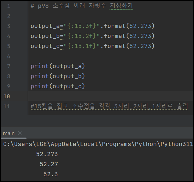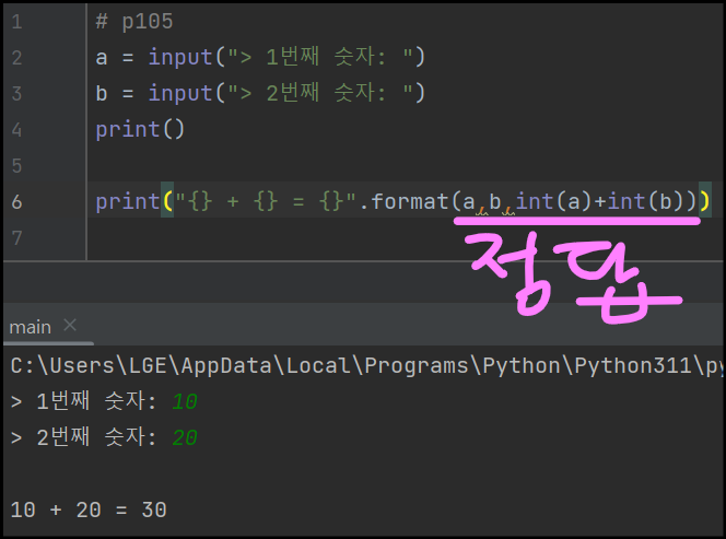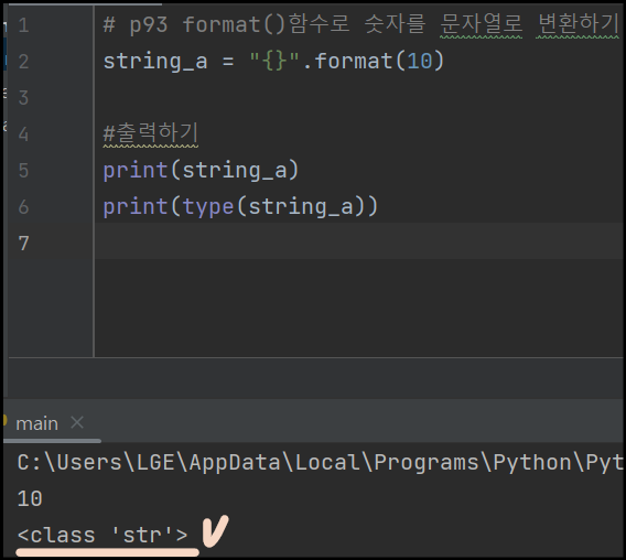 앞쪽에 있는 문자열의 {}기호가 format()함수 괄호 안에 있는 매개 변수로 차례로 대치되면서 숫자가 문자열이 되는 것입니다.