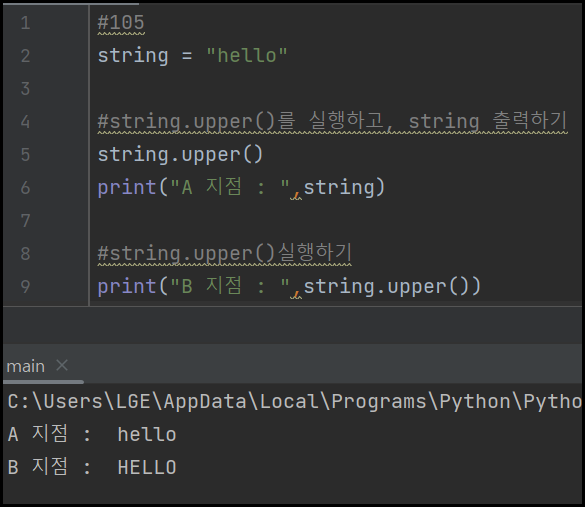 upper()함수와 lower()함수를 이용하면 a 의 문자열이 바뀔 것으로 생각하는데, 절대로 원본은 변하지 않는다는 것을 기억하세요👉이렇게 원본을 변화시키지 않는 함수를 '비파괴적 함수'라고 부릅니다. (이와 반대되는 파괴적 함수는 4장에서 알아보도록 하겠습니다.)