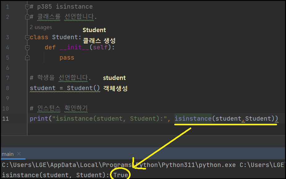 isinstance()함수는 첫 번째 매개변수에 객체(인스턴스), 두 번째 매개변수에 클래스를 입력합니다.