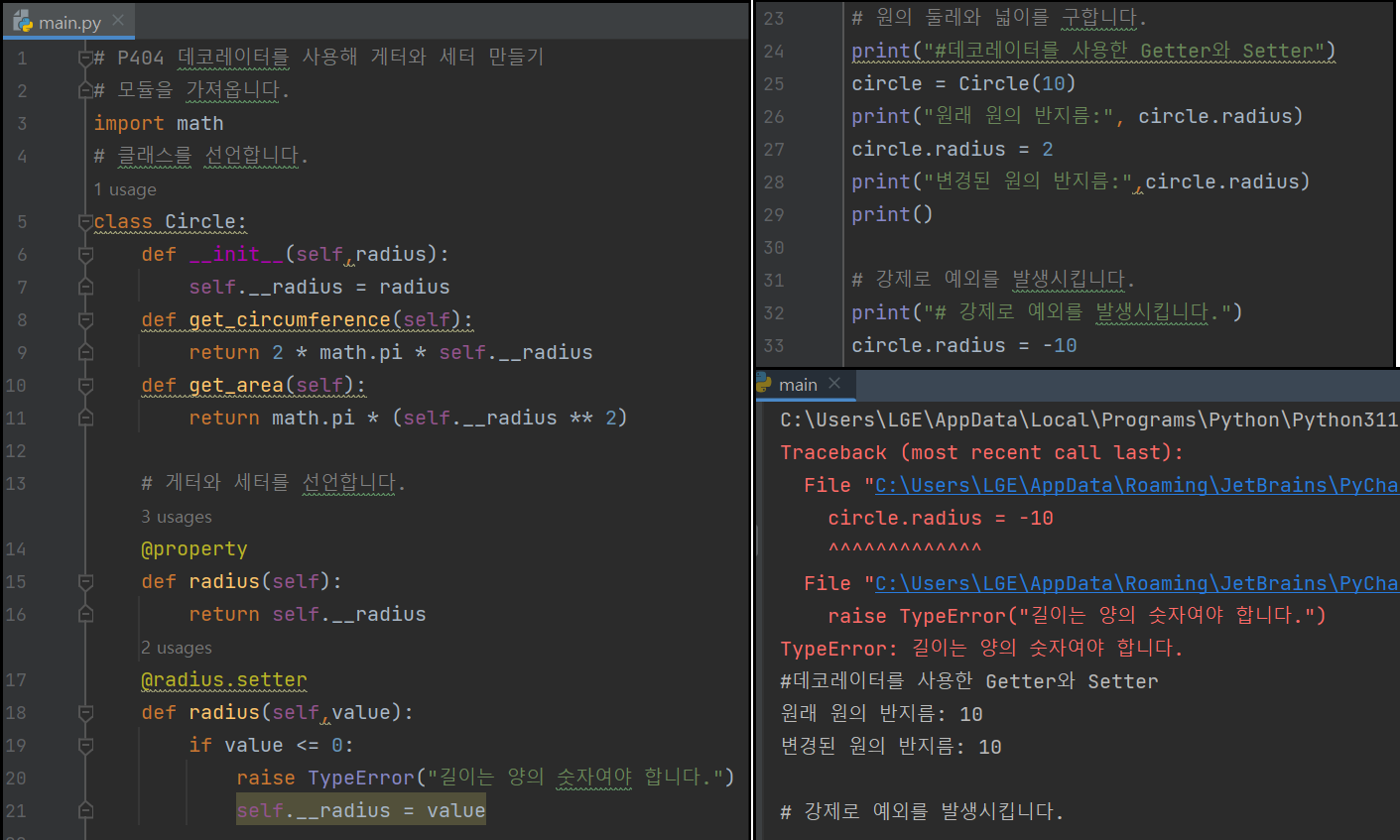 예를 들어 set_radius()함수에 다음과 같은 코드를 추가하면 _ _radius에 할당할 값을 양의 숫자로만 한정할 수 있다.