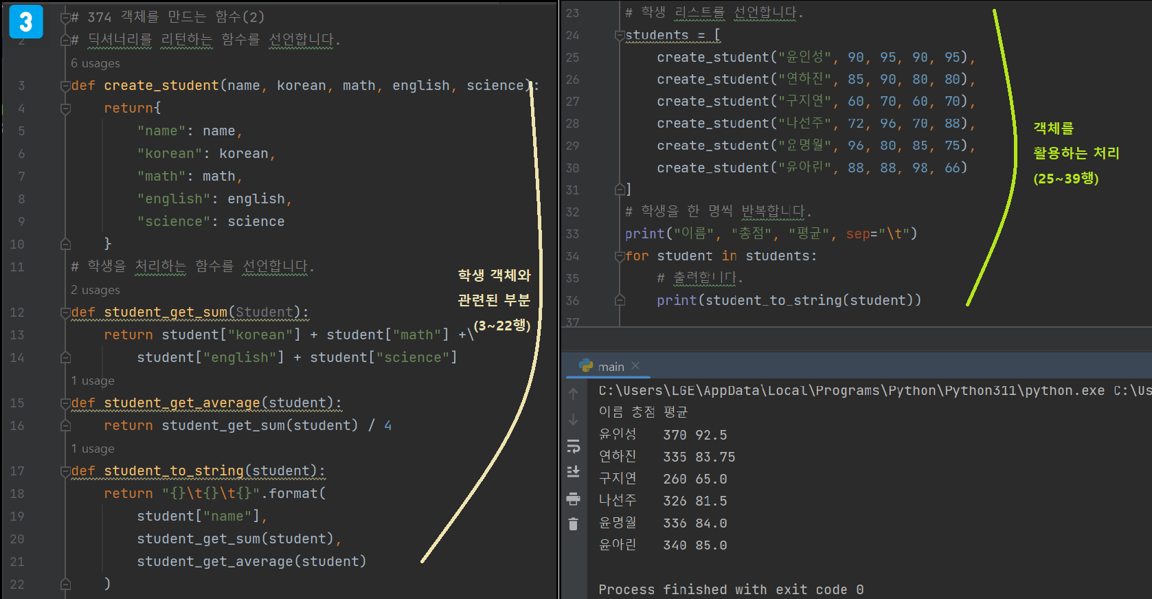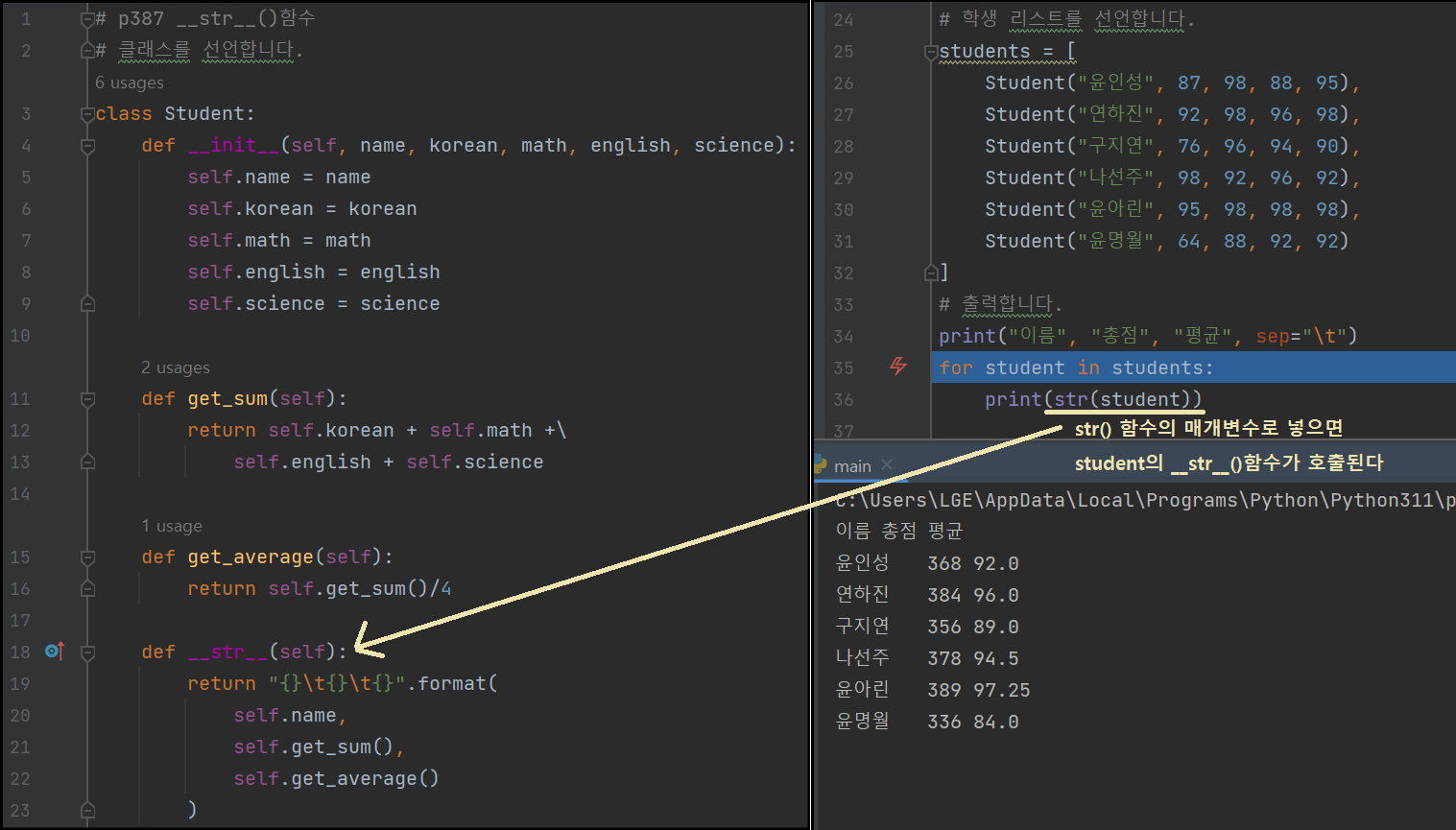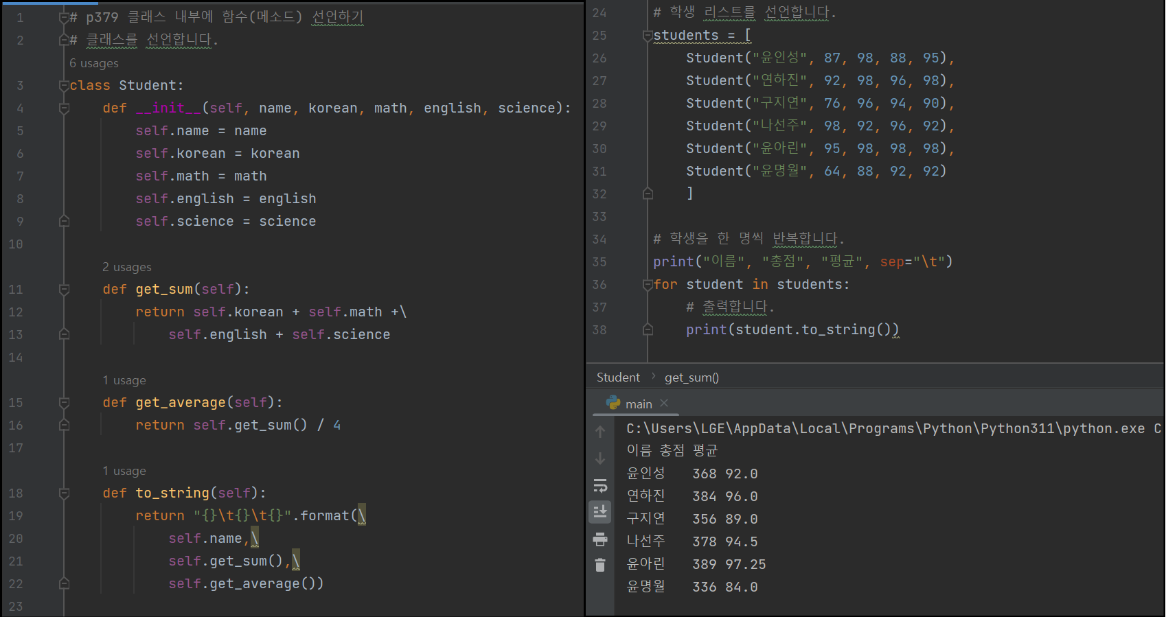 374쪽(위의 객체3️⃣코드)에서 만들었던 student_get_sum(), student_get_average(), student_to_string() 함수를 클래스 내부에 구현해보도록 하자. 이전에는 매개변수로 student를 받았었는데, 이번에는 함수를 생성할 때 self 를 입력한다.