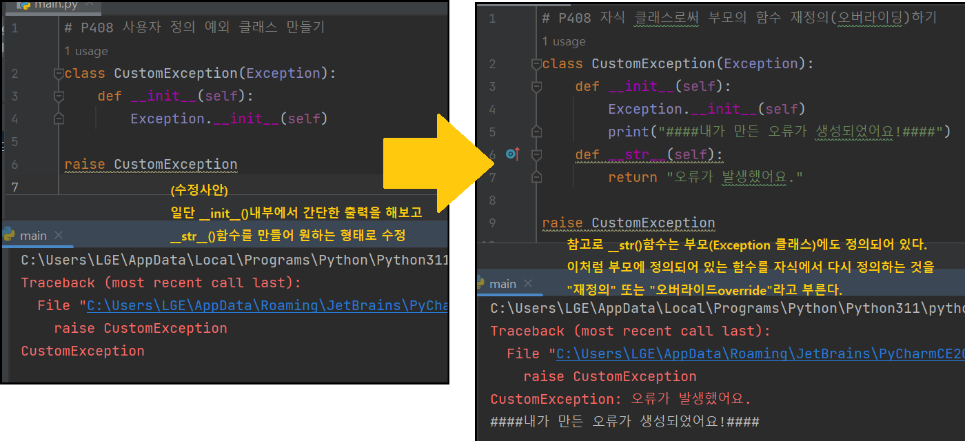 상속은 기존에 있는 클래스를 기바능로 조금 수정해서 내가 원하는 클래스를 만들 때 사용한다. 그럼 Exception이라는 기존에 있는 클래스를 조금 수정해서 CustomException이라는 클래스를 만들어 보자.