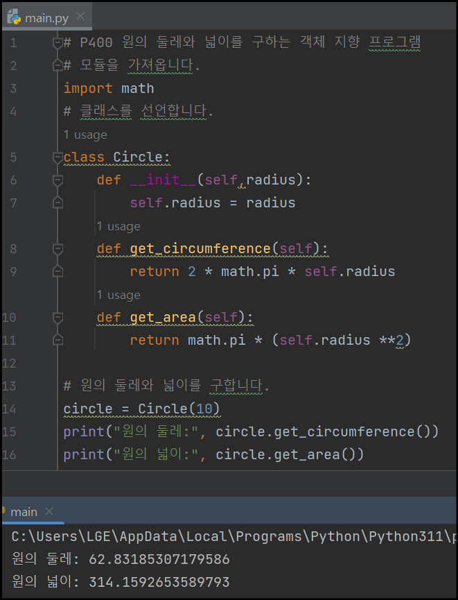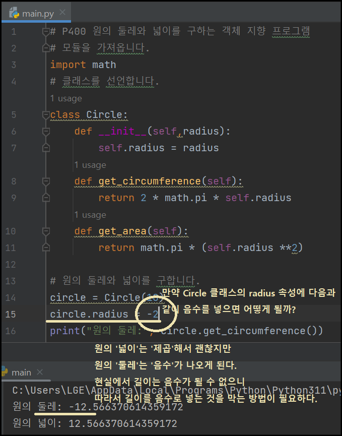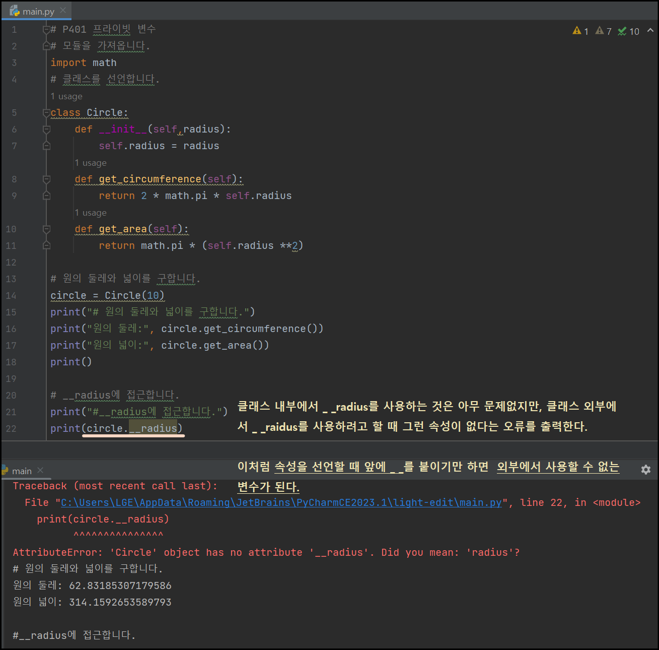 그런데 중간에 원의 둘레를 변경하고 싶다면 어떻게 해야 할까? 클래스 외부에서 직접 _ _radius속성에 접근할 수 없기 떄문에 간접적으로 접근할 수있는 방법을 찾아야 한다.