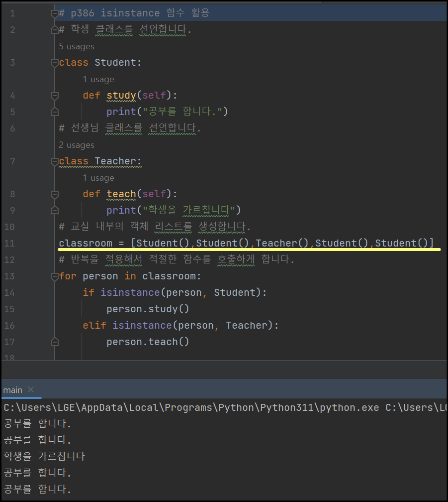 일반적으로 객체 지향 프로그래밍은 모든 데이터를 클래스로 구현한다. 이러한 데이터를 관리할 때 종류별로 리스트를 따로 만들고 활용해야 한다고 생가하는 경우가 많은데, isinstance()함수를 사용하면 이처럼 하나의 리스트로도 여러 종류의 데이터를 다룰 수 있다.