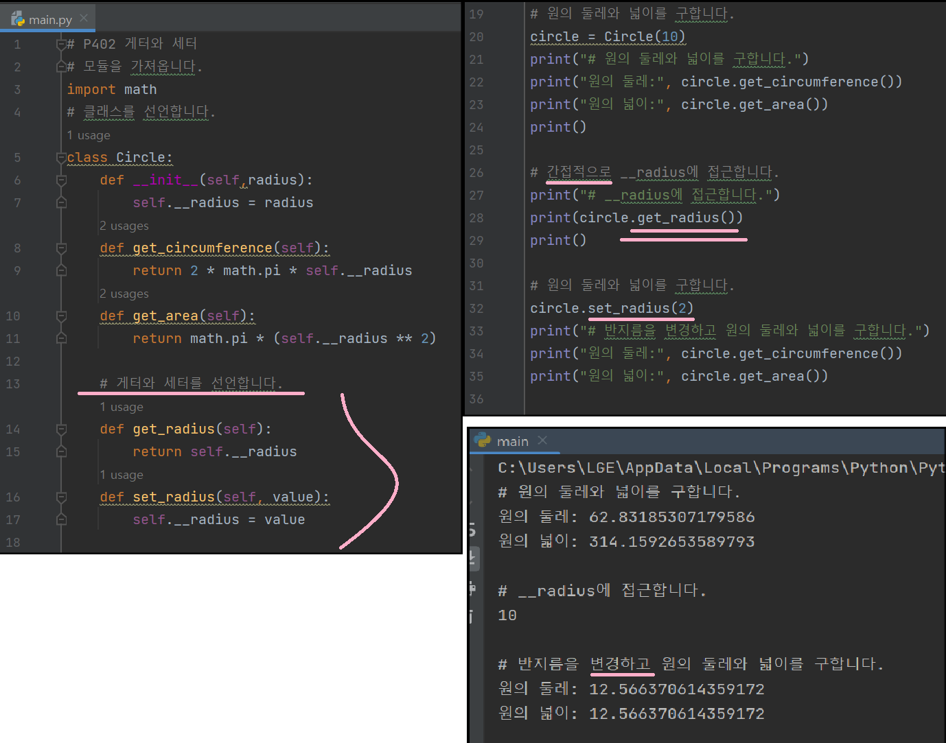 (위 사진) get_radius()함수와 set_radius()함수를 만들어서 함수로 프라입시 변수의 값에 접근하거나, 값을 변경하게 했다.