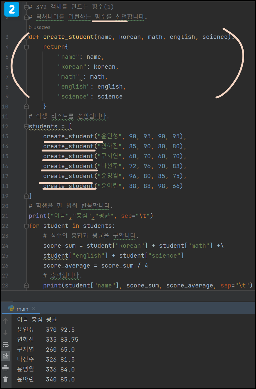 2️⃣그런데 딕셔너리로 객체를 하나하나 만드니 조금 복잡하고 귀찮다. 딕셔너리를 만들 때 키를 잘못 입력하는 실수 가 일어날 가능성도 있다. 따라서 딕서너리를 생성하는 코드(맨위의 오른쪽 코드)처럼 함수로 만들면 어떨까? 함수로 만들게 되면 딕셔너리를 입력할 때보다 쉽고, 키를 잘못 입력하는 실수도 하지 않게 된다. |