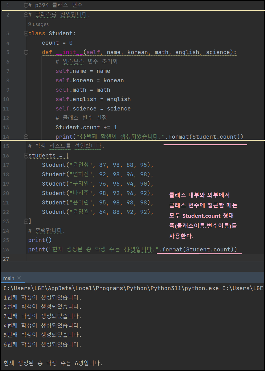 클래스 변수는 class 구문 바로 아래의 단계에 변수를 선언하기만 하면 된다. 이렇게 만들어진 클래스 변수는 다음과 같이 사용된다.