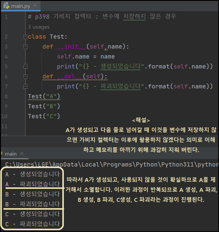 어쨌든 프로그램에서 변수를 만들면 데이터가 메모리에 올라가고, 계속 만들다 보면 메모리가 가득 차버릴 것이다. 👉이를 방지하기 위해 파이썬 프로그래밍 언어에는 '가비지 컬렉터'라는 것이 있다. 가비지 컬렉터는 더 사용할 가능성이 없는 데이터를 메모리에서 제거하는 역할을 한다.
