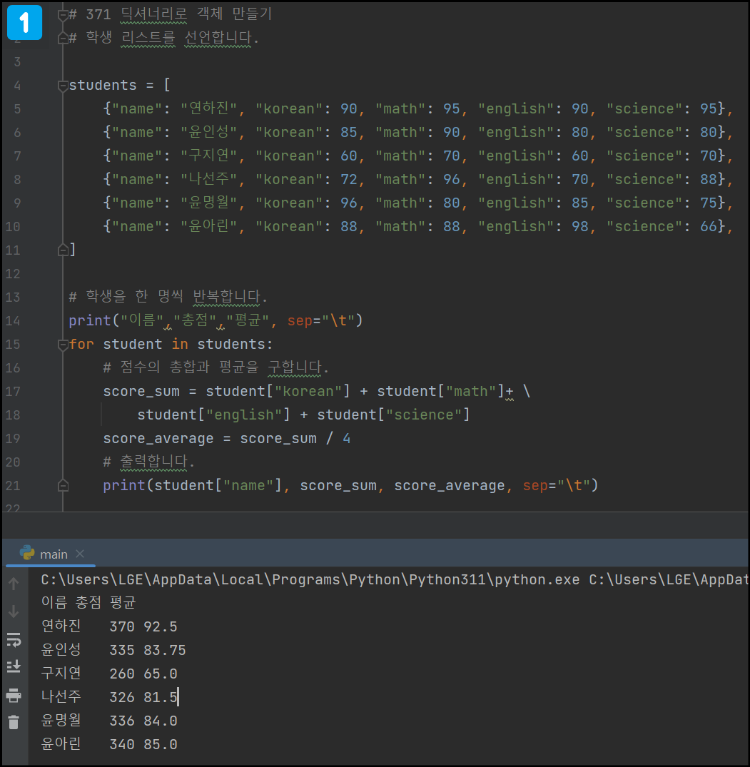 3️⃣조금 더 생각해 볼까? 현재 총점과 평균을 구하는 처리는 학생을 대상으로만 이루어진다 따라서 학생을 매개변수로 받는 형태의 함수로 만들면 코드가 조금 더 균형잡히지 않을까? 실행결과는 이전과 같지만 코드가 조금씩 분리되고 있다. 학생이라는 객체와 관련된 기능이 위로 올라갔고, 이러한 객체를 사용하는 처리가 아래로 내려갔다. 이렇게 만들면 '학생 객체와 관련된 기능'을 별도의 모듈로 빼서 관리할 수도 있다. 이러한 형태로 객체와 관려된 코드를 분리할 수 있게 하는 것이 객체 지향 프로그래밍의 핵심이라고 할 수 있다. 그런데 이런 크도가 너무 자주 사용되다 보니, 개발자들은 클래스Class라는 구조를 만들게 되었다. |