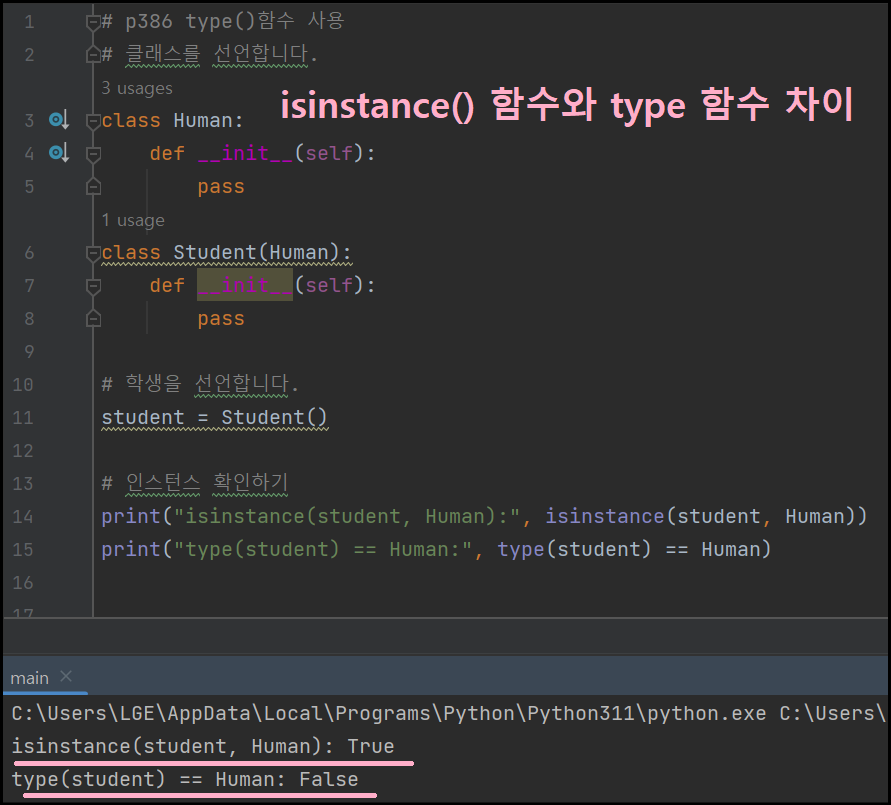 - 이러한 상속 관계에 따라서 객체가 어떤 클래스를 기반으로 만들었는지 확인할 수있게 해주는 isinstance() 함수,