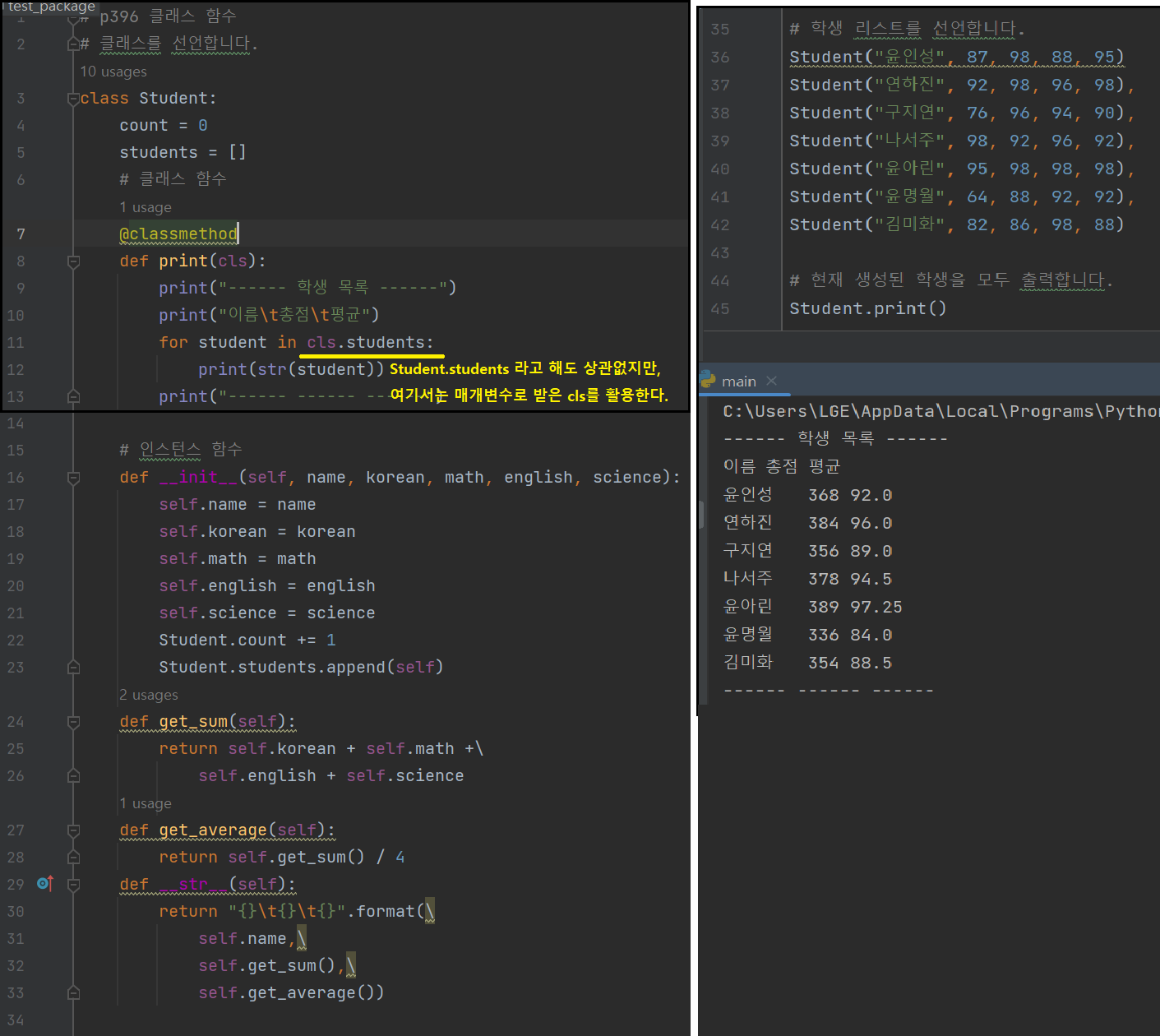 클래스 함수의 첫 번째 매개변수에는 클래스 자체가 들어온다. 일반적으로 cls(그냥 '클래스'라고 읽으면 된다.)이름의 변수로 선언하며, 이렇게 만들어진 클래스 함수는 다음과 같이 사용한다.