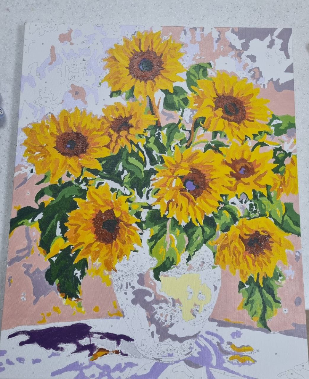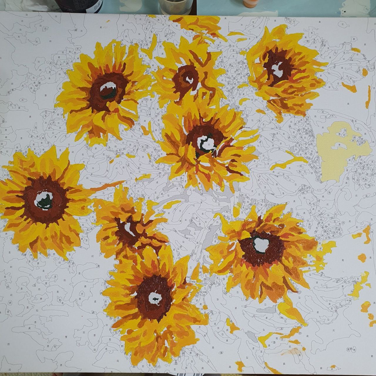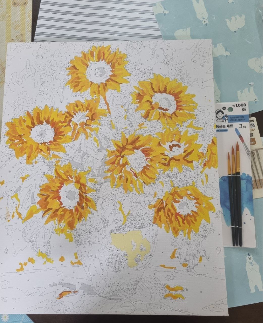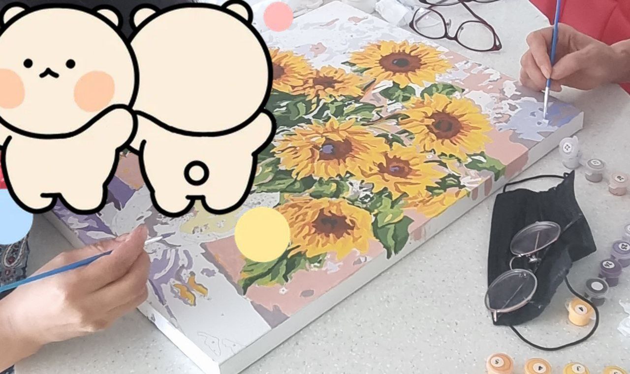 1차로 전체채색 다하고 꽃잎 부분을 좀 더 입체감 있게 표현하고 싶어서 남은 물감들 덧발라서(살릴려고) 👉 다이소 물감 은 색깔이 영 이었다..... 음 내가 색을 잘 못섞는 건가. 다른 아크릴 물감은 가격대가 있어서 이번판엔 도전안했음.