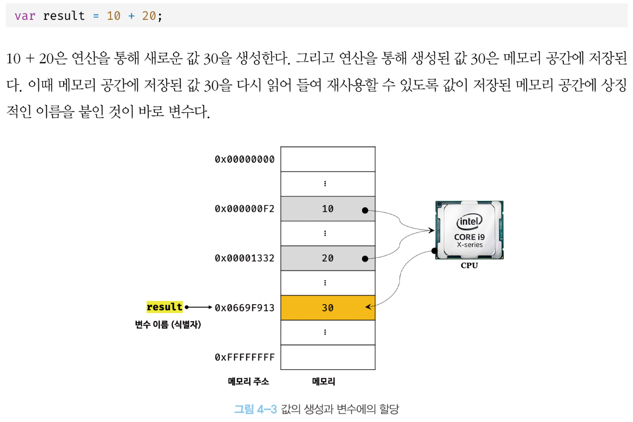변수란 하나의 값을 저장하기 위해 확보한 메모리 공간 자체 또는 그 메모리 공간을 식별하기 위해 붙인 이름이라고 했다. 따라서 변수에 할당되는 것은 값이다.
