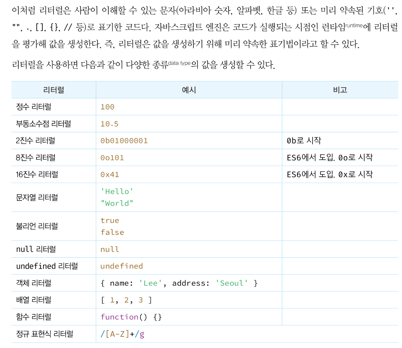 5.2 리터럴literal은 사람이 이해할 수 있는 문자 또는 약속된 기호를 사용해 값을 생성하는 표기법motation을 말한다.