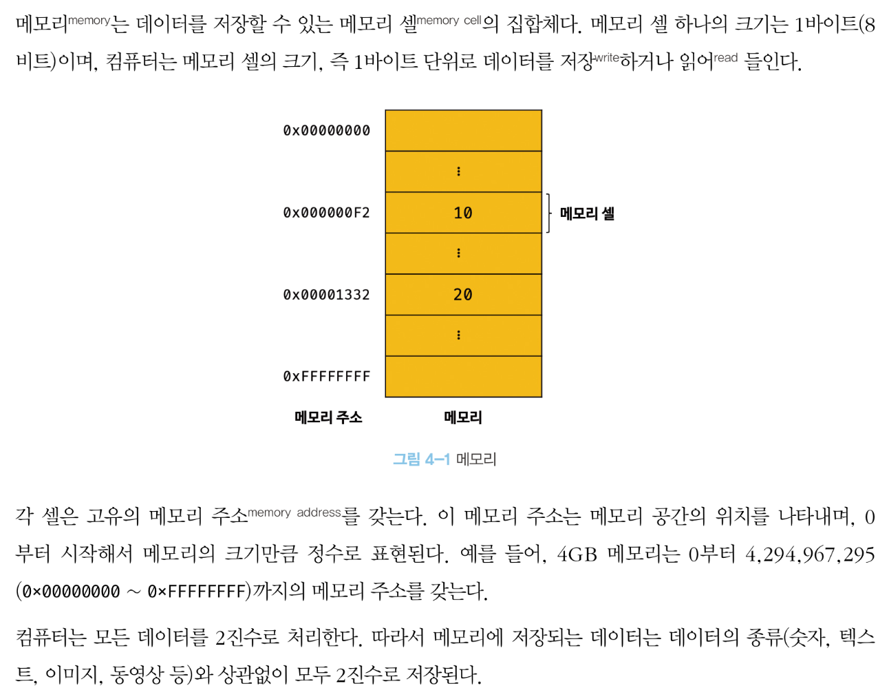 예를 들어, 4GB 메모리는 0부터 4,294,967,295(0x0000,0000 ~ 0xFFFF,FFFF) // <- 8자리 확인하려고 , 표기는 내맘대로 넣은 것.