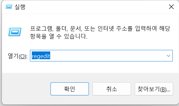 윈도우 + R 키 , regedit 를 입력해서 👉` 레지스트리 편집기를 실행