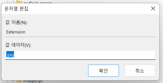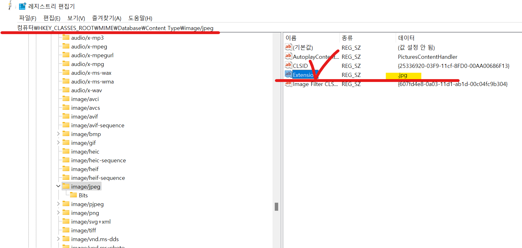 레지스트리 편집기 왼쪽 목록에서 \HKEY_CLASSES_ROOT\MIME\Database\Content Type\image\jpeg 를 순서대로 찾아 들어가, 오른쪽의 Extension 항목의 .jfif의 설정을 👉.jpg로 바꾼다.