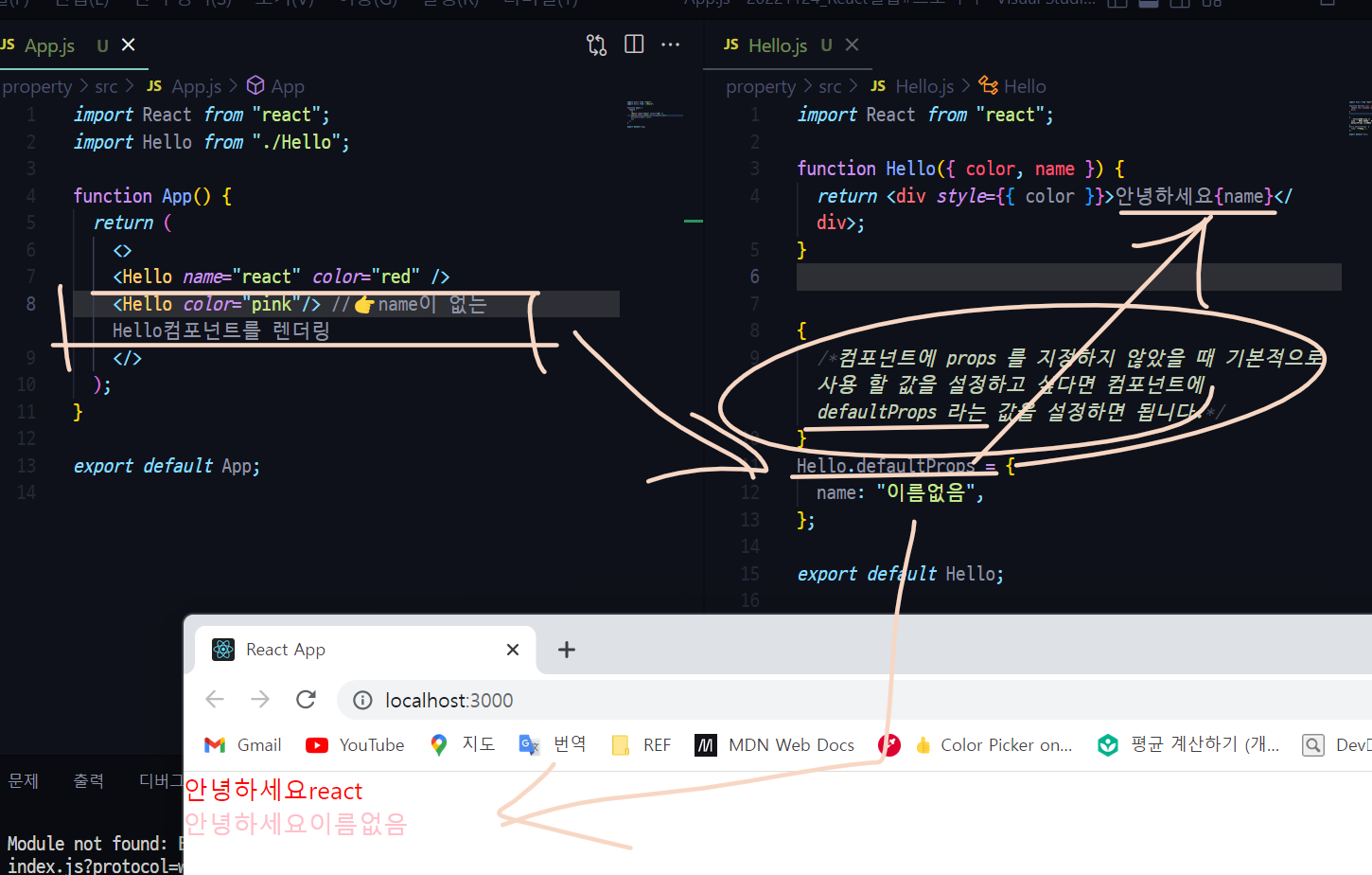 컴포넌트에 props 를 지정하지 않았을 때 기본적으로 사용 할 값을 설정하고 싶다면 컴포넌트에 defaultProps 라는 값을 설정하면 됩니다.